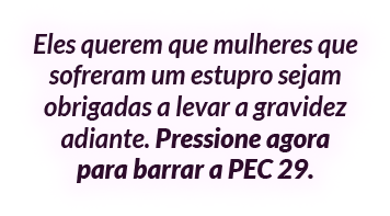 A PEC 29/2015 bem que podia se chamar "PEC Contra A Vida Das Mulheres". Ela propõe uma mudança na Constituição para dizer que a vida começa desde a concepção. Na prática, se essa PEC for aprovada, mulheres que engravidaram em decorrência de um estupro serão obrigadas a levar a gestação adiante. Não só elas: mulheres que gestam fetos anencéfalos e que podem morrer se continuarem a gravidez, também. Para piorar, o uso do DIU e da pílula do dia seguinte estará sob ameaça. Não podemos permitir esse retrocesso!