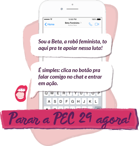 tirada da pauta e a votação adiada. Enviamos mais de 105 mil e-mails exigindo que os senadores rejeitassem a proposta e tivemos vitórias importantes, mas a luta ainda não terminou. A PEC pode voltar a pauta a qualquer momento - e nós precisaremos aumentar ainda mais nossa pressão! Para ficar sabendo dos próximos passos da tramitação e a hora certa de agir para que #ParemAPEC29, fale com a Beta no chat do Facebook! #ÉPelaVidaDasMulheres